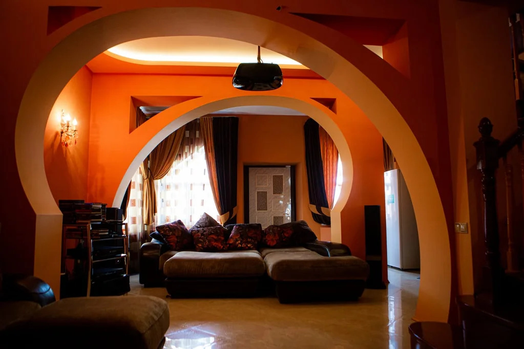 Общая площадь дома составляет 465 кв.м., стиль интерьера —